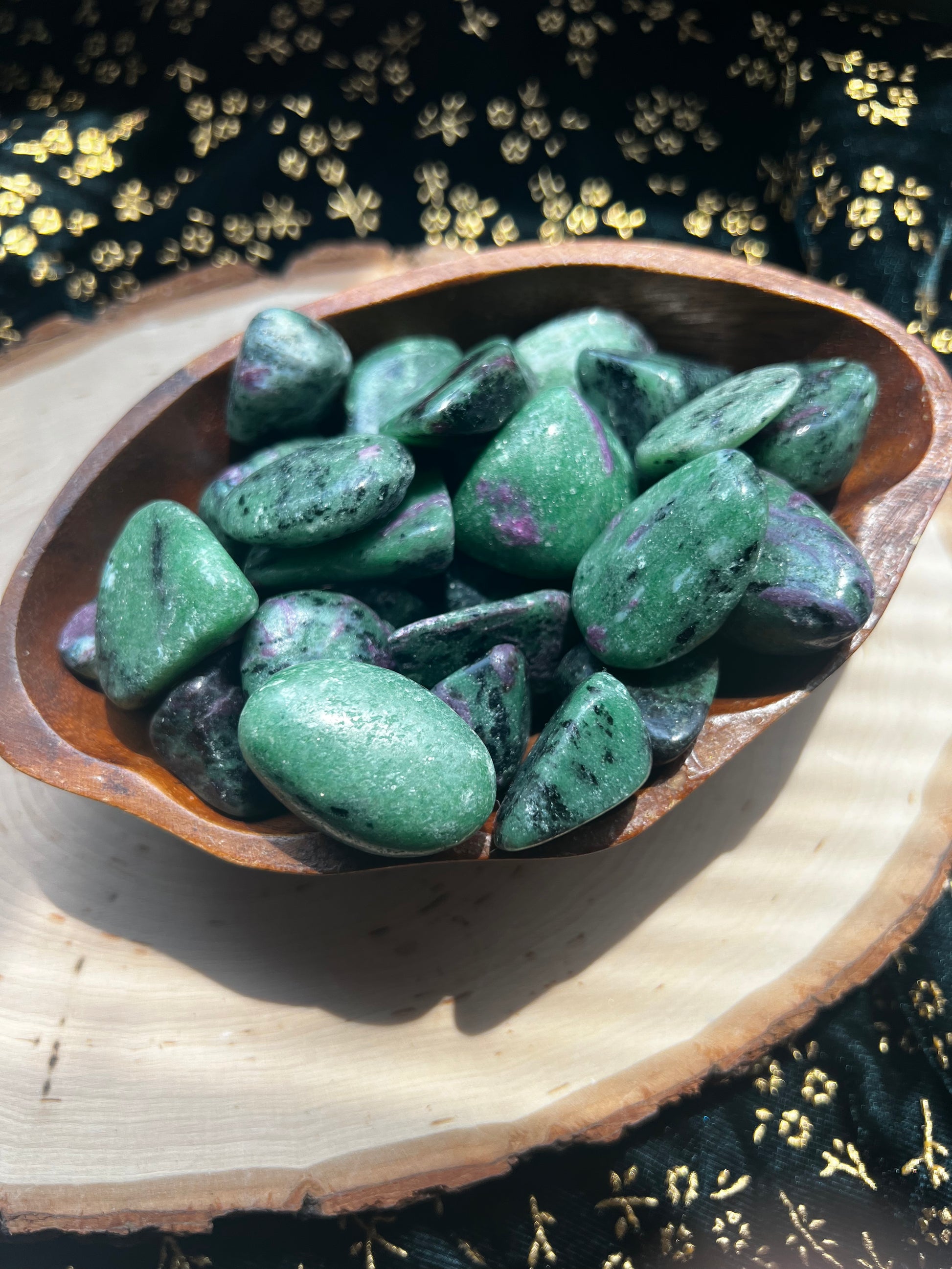 Ruby Zoisite is a striking fusion of green zoisite and pink-red ruby, blending grounded growth with fiery passion. This stone supports both the heart and crown chakras, making it a bridge between physical desires and spiritual insight. It’s especially useful for those navigating personal transformation or reconnecting with purpose.